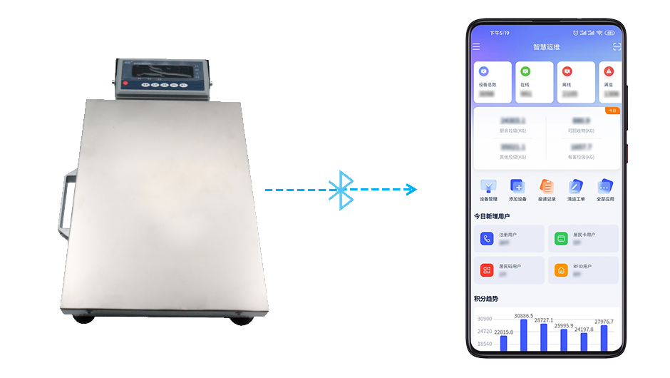 一款应用于上门回收,移动式收运,可靠稳定的智能称重产品。支持“智慧运维APP”联动使用;减少手持终端、蓝牙打印机设备;集成上门回收系统;电池/电源双供电系统。